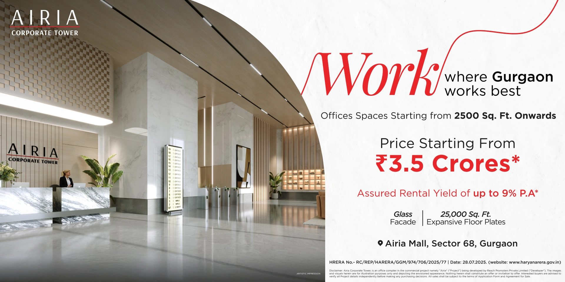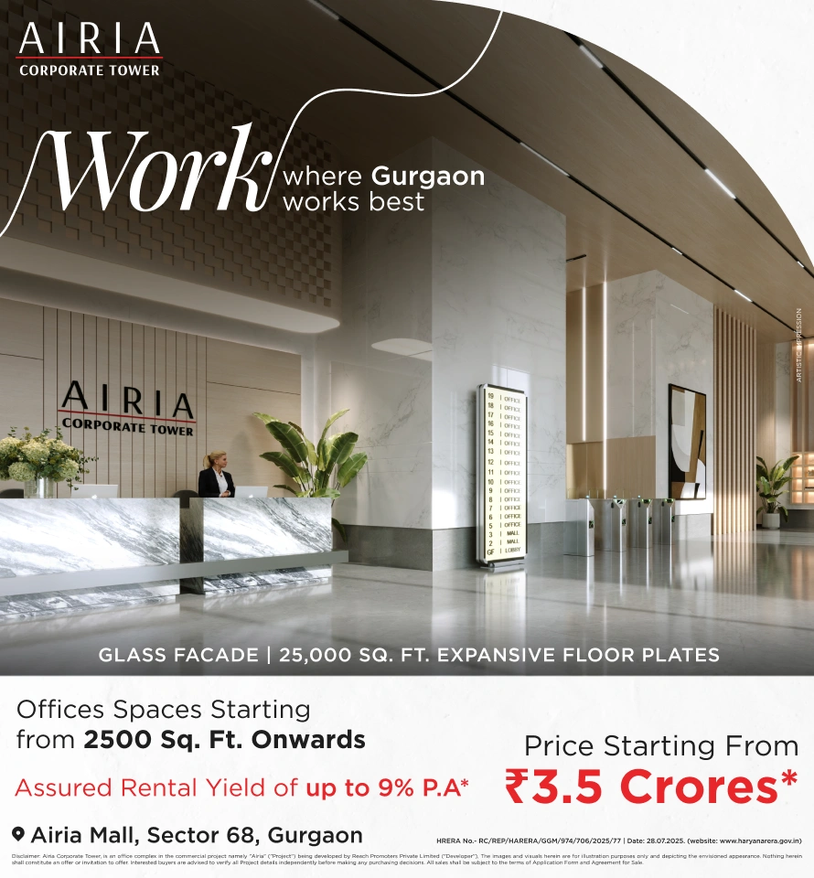 Disclaimer: Airia Corporate Tower, is an office complex in the commercial project namely “Airia” ("Project") being developed by Reach Promoters Private Limited ("Developer"), having HARERA registration No. RC/REP/HARERA/GGM/974/706/2025/77 dated 28-07-2025 available on www.haryanarera.gov.in. The images, visuals, contents, plans and layouts herein are for illustration purposes only, not to scale and are only depicting the envisioned appearance. The approach time may vary subject to weather, traffic or other external factors. The referencing of any operators or brands, if any, is only hypothetical and for reference purposes only. The Developer reserves the right to make changes without prior notice as per applicable laws. The approvals can be checked at the RERA website and/or at the office of the Developer. Interested buyers are advised to verify all Project details independently before making any purchasing decisions. Nothing herein shall constitute an offer or invitation to offer. All sales shall be subject to the terms of Application Form and Agreement for Sale. Unit Conversions: 1 sq. ft. = 0.0929 sq. mtr.; 1 km = 1000 mtr.; 1 min = 60 seconds.